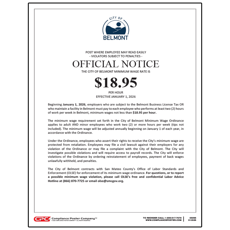 Employers licensed to do business in Belmont, California are required to post this notice in the workplace to inform employees of their rights under the Belmont Minimum Wage Ordinance. The city of Belmont minimum wage rate is $18.30 per hour effective January 1st, 2025.