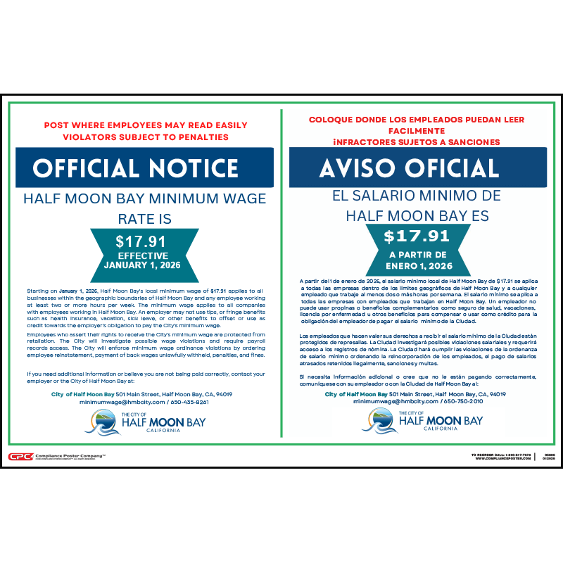 All employers operating in the City of Half Moon Bay, California are required to pay their employees no less than the effective minimum wage rate and post an official notice of employees’ rights under the City’s Minimum Wage Ordinance in the workplace. Half Moon Bay, CA Minimum Wage is $17.47 per hour effective January 1st, 2025.