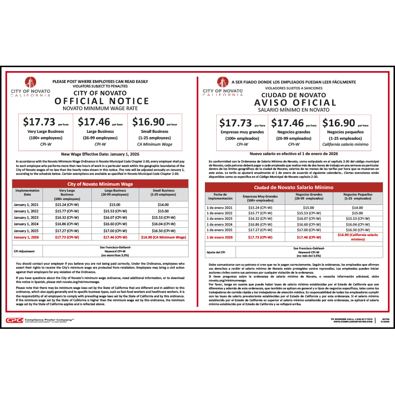 Every employer of an employee who performs two hours of work in a given week within the City of Novato must post the annual Novato, CA Minimum Wage Poster. Starting January 1, 2025, the minimum wage within Novato city limits will increase based on business size to: