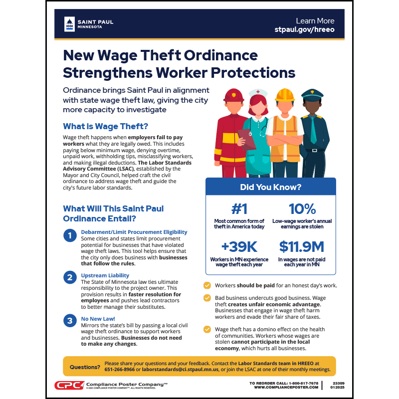 Effective January 1, 2025, the City of Saint Paul, Minnesota strengthened worker protections through a new wage theft ordinance that aligns with state law, streamlining enforcement and ensuring fair treatment for workers. This ordinance delivers faster resolutions for employees and holds employers accountable.