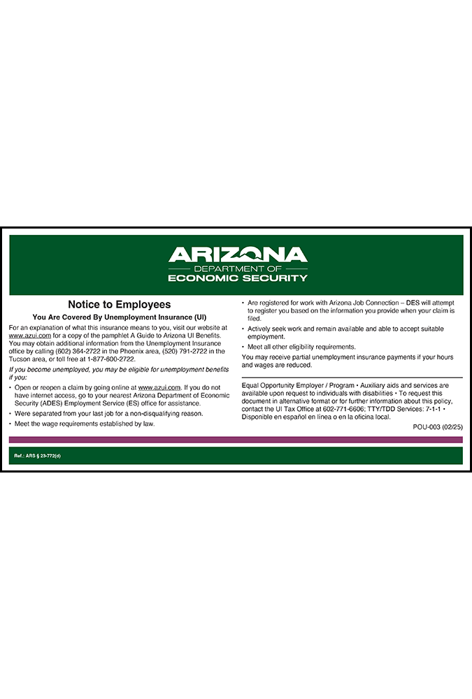 The 2025 Arizona Unemployment Insurance Peel ‘N Post™ adheres to existing Arizona All-On-One™ Labor Law Posters to ensure required workplace posters are up to date with state law and posting requirements.