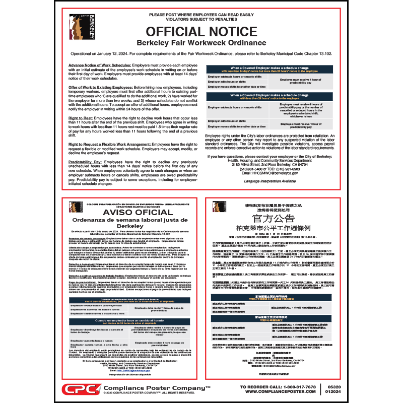 - To inform employees of their rights under the Fair Workweek Law, covered employers must post the Berkeley Fair Workweek Poster prominently in areas at the work site where it can be seen by all employees. (BMC § 13.102.100)