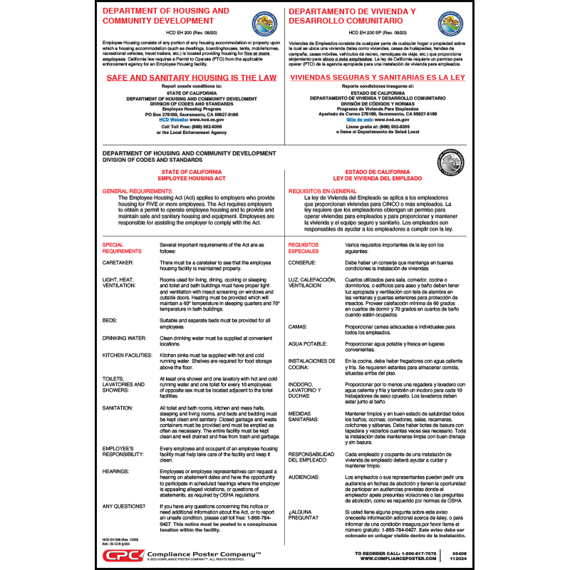 - The Employee Housing Act Information Notice (25 CCR § 624) describing the law’s requirements concerning: