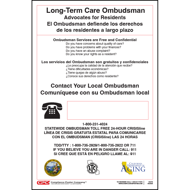 RCFEs licensees are also required to post pursuant to § 87468(c) contact information for the CCLD and the Long-Term Care Ombudsman. The main hotline number, the crisis line number and the address for the complaint department of the CCLD is provided. Space is also provided so that licensees can fill in the local number and address for the CCLD and LTCO. A web address is provided where licensees may find CCLD and LTCO local contact information.