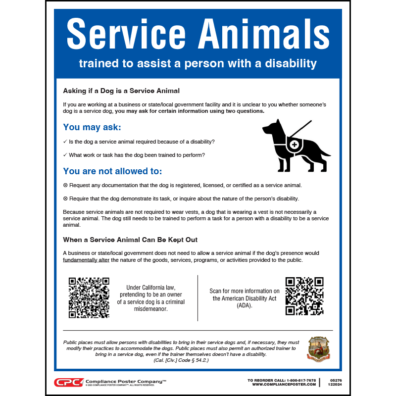 The California Service Animals Poster informs employees what questions they may ask the patron with a dog. The poster also includes QR codes to access more information about the ADA and the consequences of misrepresenting an animal as a service dog under California law.
