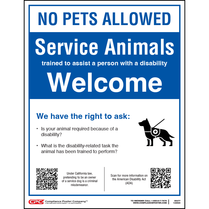 The California Service Animals Window Cling may be used by businesses with glass entrances, storefronts, or other smooth surfaces at facility entrance points. The window cling clearly communicates prior to entering the business that pets are not allowed on the premises. The window cling clarifies that service animals are allowed, and employees have the right to ask patrons questions about the animals.