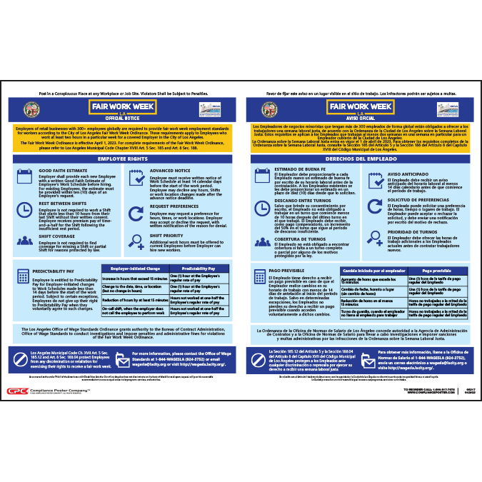 Employers of retail businesses with 300+ employees (globally) located in Los Angeles, California, are required to post the official City of Los Angles, CA Fair Work Week Poster informing employees of their right to predictable work schedules.