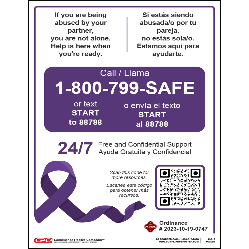 Under the San Antonio Domestic Violence Signage Ordinance (No. 2023-10-19-0747), all public accommodations in San Antonio, Texas must post the Domestic Violence sign in restrooms used by visitors or employees. A place of public accommodation includes “every business within the city, whether wholesale or retail, which is open to the general public and offers, for compensation, any product, service or facility. The term place of public accommodation shall include, but not be limited to, all taverns, hotels, motels, apartment hotels, apartment houses with four or more tenant units, restaurants or any place where food or beverages are sold, retail and wholesale establishments, hospitals, theaters, motion picture houses, museums, bowling alleys, golf courses and all public conveyances, as well as the stations or terminals thereof.”
