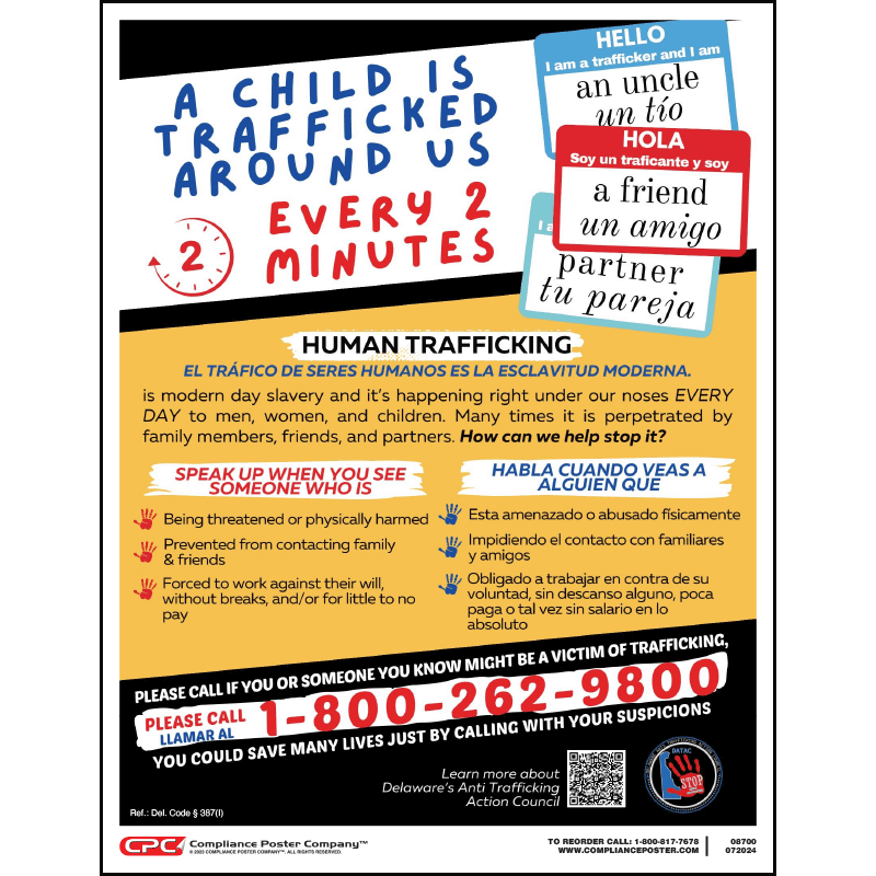 The Delaware Human Trafficking Poster must be at least 8.5″ x 11,” and contain centralized human trafficking hotline. Non-compliance with the poster requirements may result in civil penalties. (Delaware Code, Title 11, Sec. 787(l))