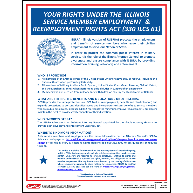 All Illinois employers must notify ISERRA-covered employees of their rights and benefits under the law. Employers can meet this requirement by posting ISERRA in the workplace.