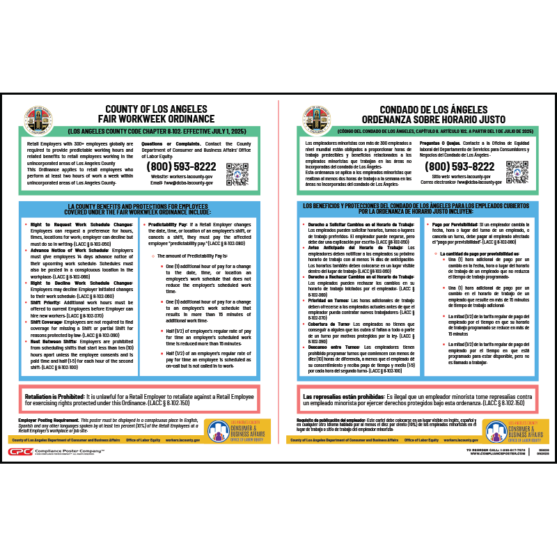 - Effective July 1, 2025, the Los Angeles County, CA Fair Workweek Ordinance (L.A.C.C. 8.102) requires large retail employers with retail employees who perform work within the unincorporated areas of Los Angeles County to post the Los Angeles County, CA Fair Workweek Poster at any workplace or job site where any covered retail employee works to inform them of their rights under the Fair Workweek Ordinance.