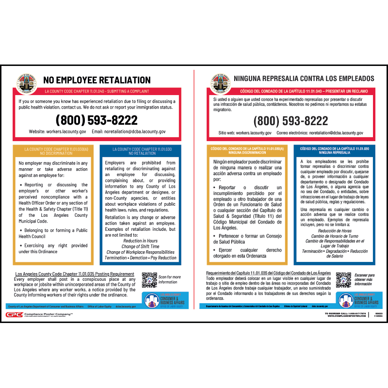 - The No Employee Retaliation Poster must be posed in a conspicuous place at any workplace or job site within unincorporated areas of Los Angeles County where any covered worker works.
